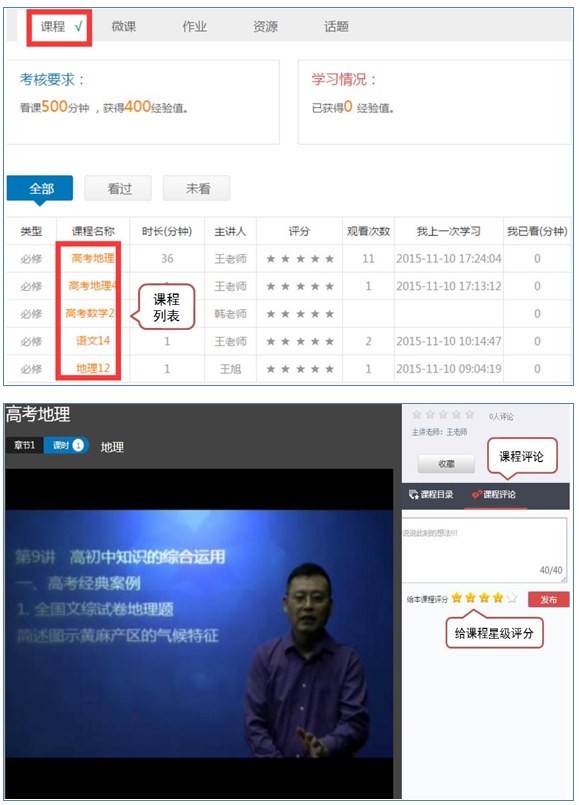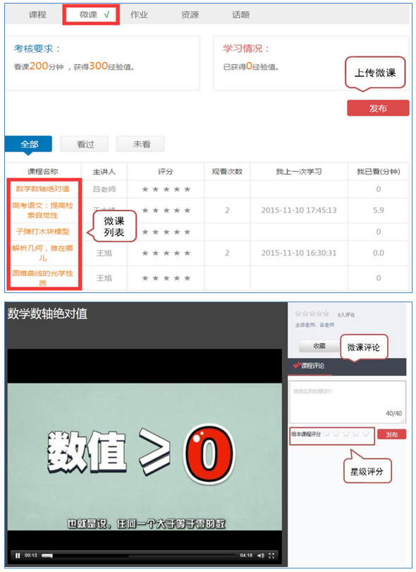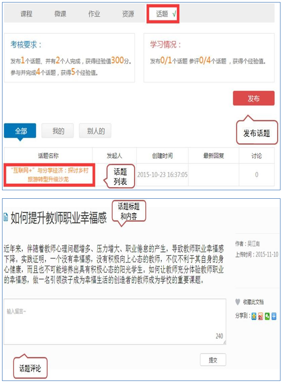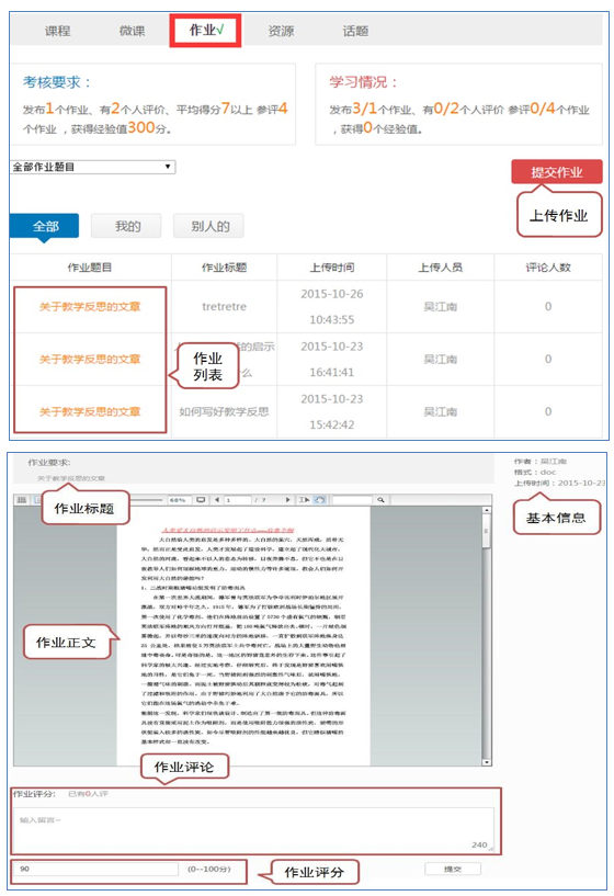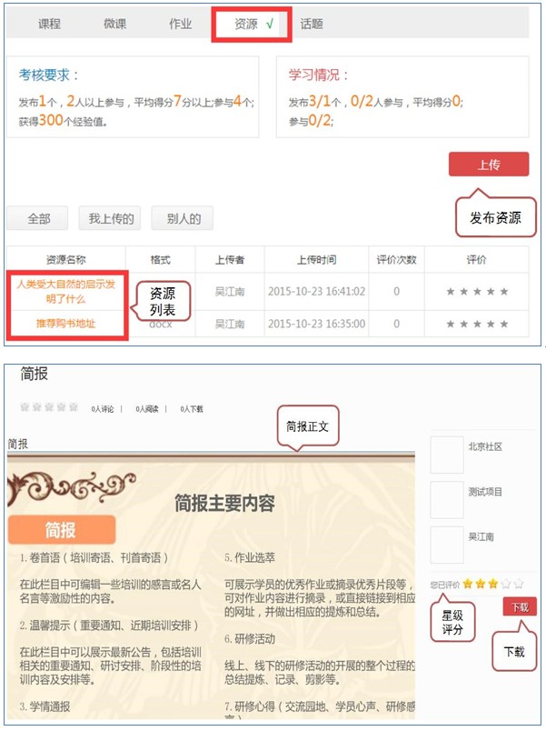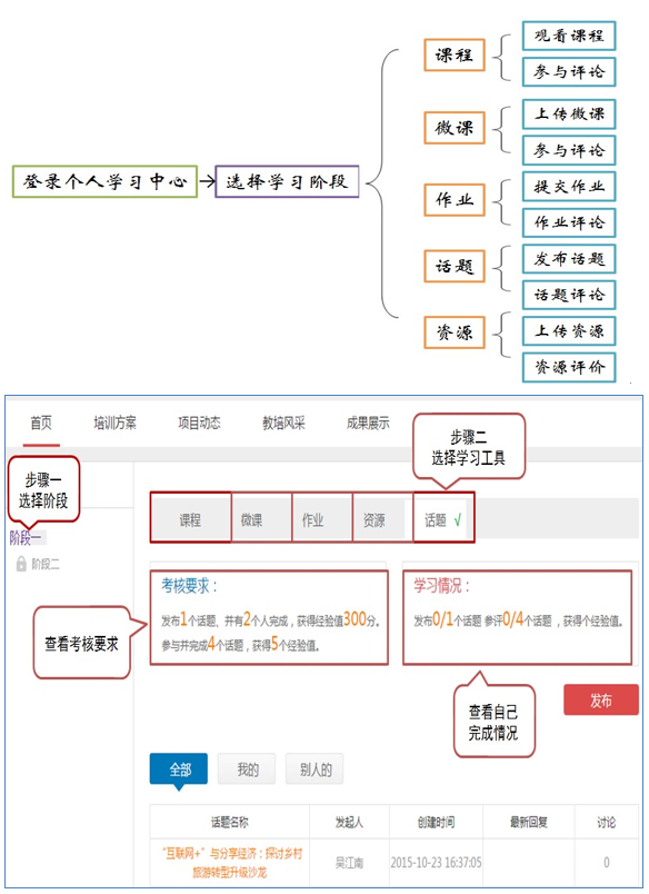 学习是分阶段进行的,学员学习时首先选择阶段,每个阶段下有不同的考核项,分别为课程、微课、作业、资源、话题,学员根据考核要求进行学习即可。