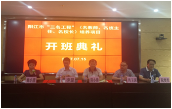 2017年7月15日下午,由阳江市教育局主办,全国教师培训网协办的阳江市中小学名校长、名教师、名班主任培养项目(以下简称“阳江‘三名工程’培养项目”)2017年集中培训开班典礼在阳江职业技术学院顺利举行。阳江市教育局局长陈小锋、副局长曾小清,北京师范大学教育培训中心执行副主任肖卫国出席了此次会议并发表了讲话;出席本次开班典礼的领导还有阳江职业技术学院副院长阮奕光、北京师范大学教育培训中心专家委员会副主任李罡;阳江市“三名工程”110名培养对象同时参加了此次会议。会议由阳江市教育局曾小清副局长主持。